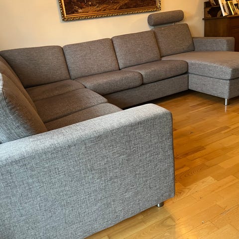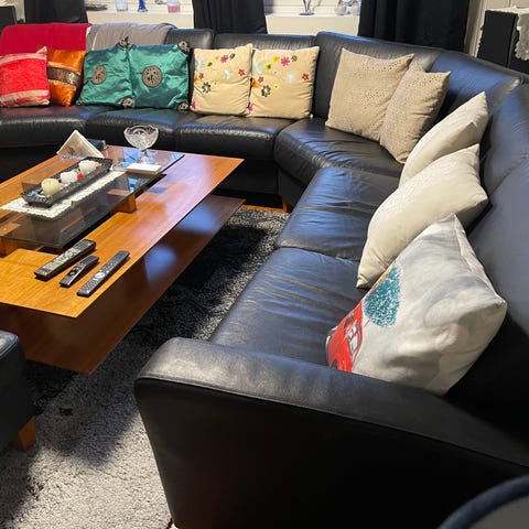 Stor og romslig u-sofa (mørke grå/svart) med salongbord.