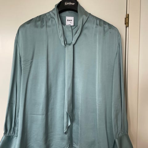 DAY Birger et Mikkelsen bluse for dame i størrelse L. Blusen er gul og laget i viskose. Modellen har lange ermer med smockdetaljer ved mansjettene og V-utringning. Passer til bruk både til hverdags og mer pyntede anledninger.