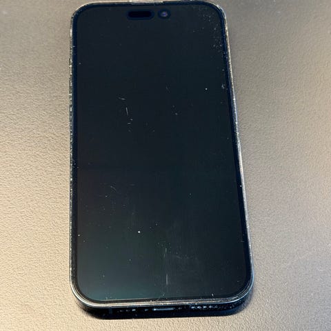 Apple iPhone 14 Pro smarttelefo. Modellen har stor skjerm med dynamisk øy-utforming i front og trippelkamera på baksiden med vidvinkel, ultravidvinkel og telelinse. Fargen fremstår som svart/mørk. Leveres i original eske med tilhørende USB‑C til Lightning-kabel og dokumentasjon, slik det vises på bildene.