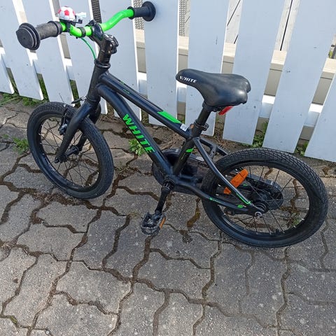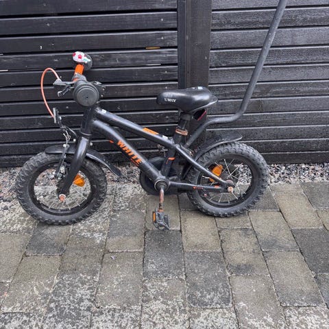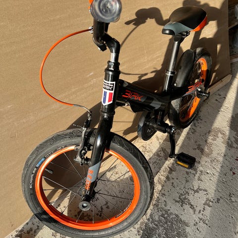 Fin og solid barnesykkel selges. Sykkelen har et stilig svart og oransje design og passer perfekt for barn som vil ha en kul og lettsyklet sykkel.