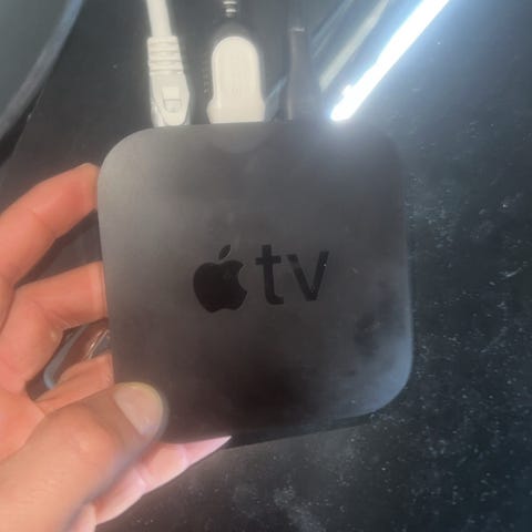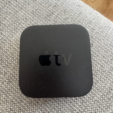 Apple TV mediespiller i svart. Enheten kobles til TV via HDMI og gir tilgang til strømming og avspilling av digitalt innhold, avhengig av modell og programvareversjon. Strømtilkobling og øvrige funksjoner følger standard Apple TV-oppsett for denne typen mediespiller. Eventuell fjernkontroll, kabler og annet tilbehør må avklares med selger.