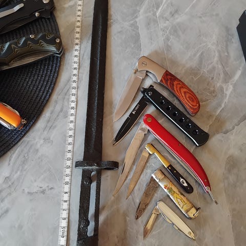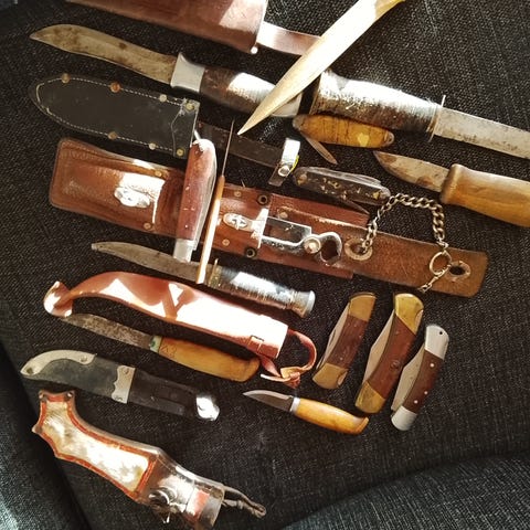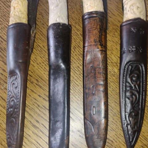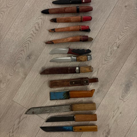 Lot med kniver selges som bilda viser høystbydende over 1200 setter bud slutt etter første bud. Tillegg for frakt.