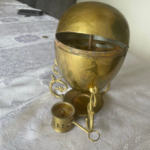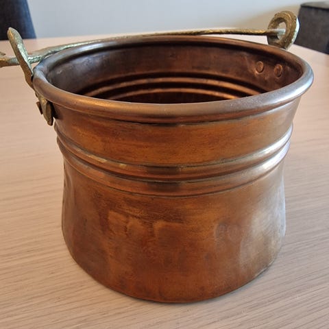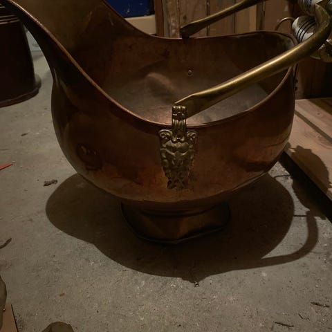 Messing vedkurv med buet form og dekorative porselenshåndtak. Kurven har fot i messing og bærehåndtak på begge sider for enkel flytting. Egnet til oppbevaring og bæring av ved ved peis eller ovn, eller som dekorativ oppbevaringskurv i stue eller gang.