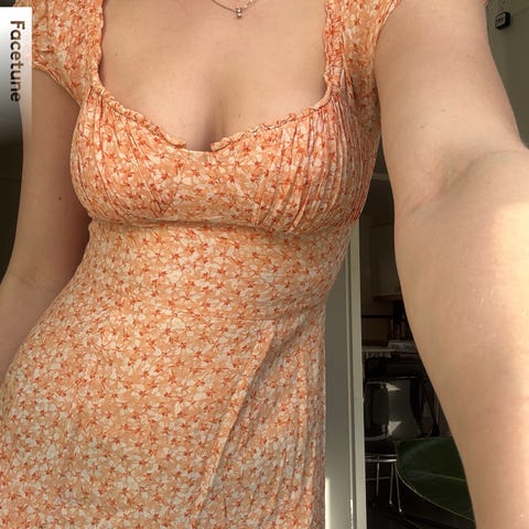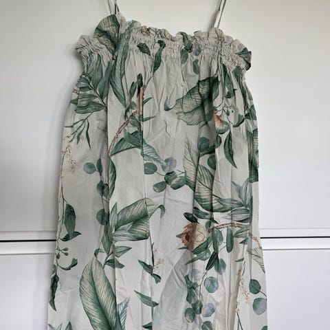 Søt sommerkjole for dame i størrelse S. Overdelen har strikk som gir tettsittende passform rundt brystet, og korte volangskuldre. Skjørtet er vidt og faller i flere lag. Passer som lett sommerkjole til hverdagsbruk eller fritid.