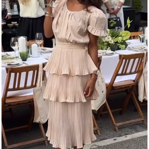 Lekker sennepsgul farge. Fin flatterende passform og flere lag med volanger og plisseer i stoffet. Brukt ved et par anledning til fotoshoot og i et bryllup.