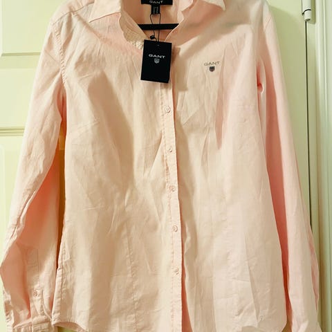 Blusen er rosa med smale vertikale striper og har lange ermer. Den er laget i bomull og har knyting i livet foran som gir en markert midje. Første bildet er funnet på nett for å vise passform.