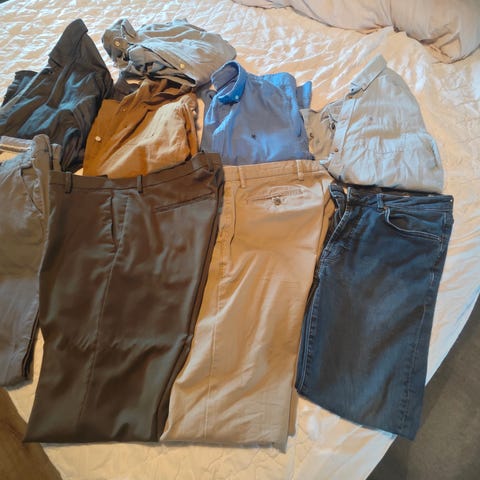 Klærne varierer fra synlig brukt til pent brukt/lite brukt (1 bukse er ny med lappe på.