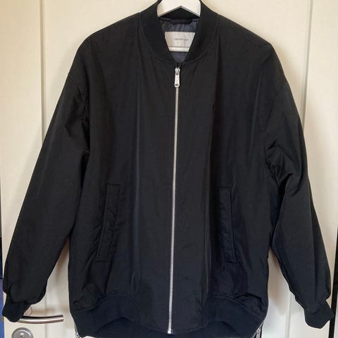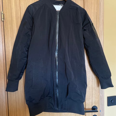 OBJECT jakke for dame i størrelse 36. Jakken er svart og lang. Den har glidelåslukking foran, ribbestrikket kant nederst og ved ermene, samt sidelommer. Innsiden har vattert, rutesteppt fôr som gir ekstra isolasjon. Passer som en enkel hverdagsjakke i overgangssesongene. en lomme har en liten rift som vist på bildet