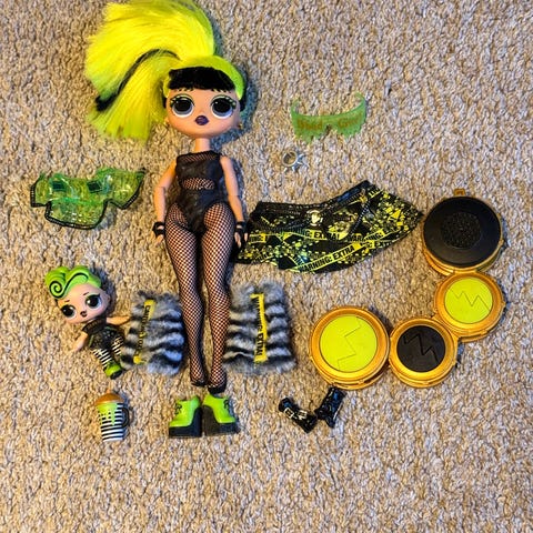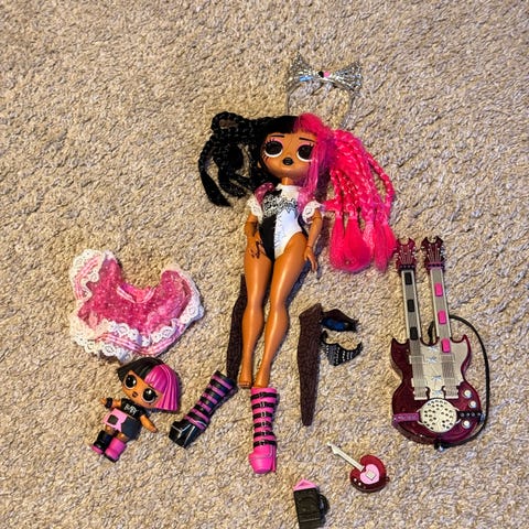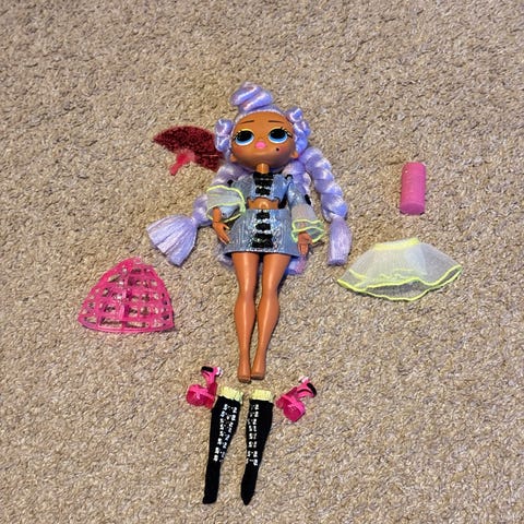 L.O.L. OMG dukke med stort rosa hår. Til dukken følger det med stativ, oppbevaringsboks med lokk, samt små tilbehør som drikkeflaske og hårbørste.
