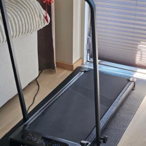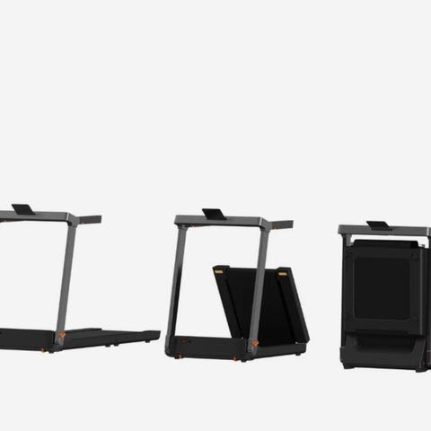 Elektrisk tredemølle i svart med enkle håndtak og sikkerhetsline. Modellen har rett styrebøyle foran og en kompakt løpeflate som egner seg til gange eller lett jogg innendørs. Kontrollpanelet er plassert øverst på frontbøylen, med rød sikkerhetsnøkkel som stopper båndet ved behov.