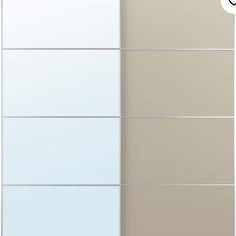 Selger skyvedører med speil til PAX med aluminiumsramme. Dette er kun skyvedørene, uten skapstamme. To dører av 1 meter hver. Kommer med komplett monteringsskinner, skruer etc.