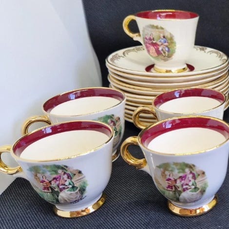 Stavangerflint moccaservise med burgunder og gull dekor.