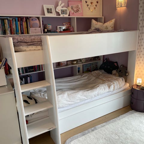 Husseng som vi har malt om da den har byttet fra jente til gutterom. Panelene foran kan males i veggfarge etter behov som jeg har gjort. Man kan sette inn gardiner og rullegardiner, henge på blomsterkasser eller knagger. Veldig fin og et utgangspunkt for mye god lek ☺️