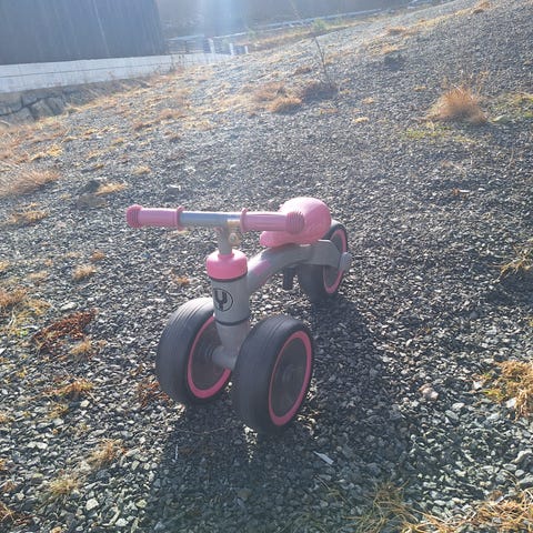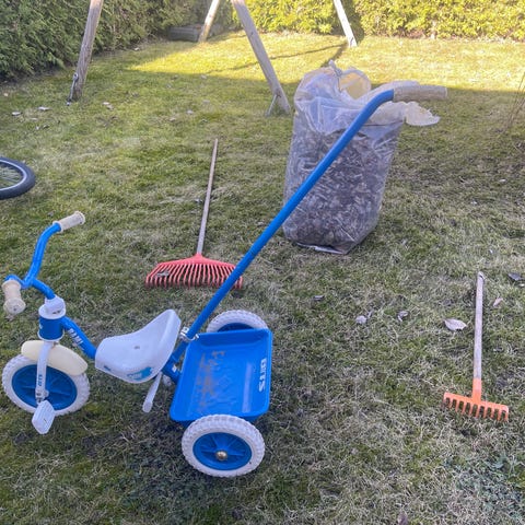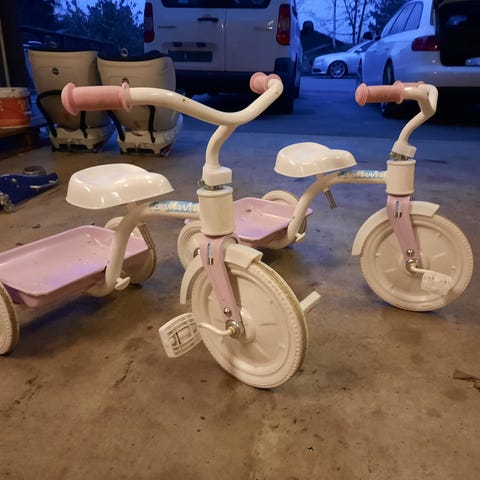 Mye brukt, men lite slitt. God trehjul sykkel. Medfølger stang så voksen slipper å bøye seg.