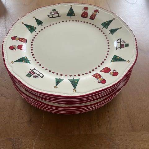 Juleservise tallerkener med julemotiv. Selges som sett slik som på bildet. Må hentes