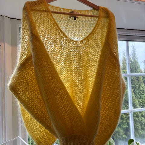 Ny hjemmestrikket poncho, farge gul, delikate paljetter nederst rundt hele. størrelse 38-42, 75% alpaca, 25%Silk
