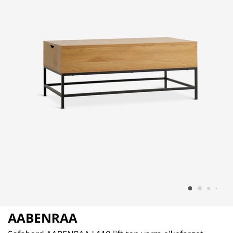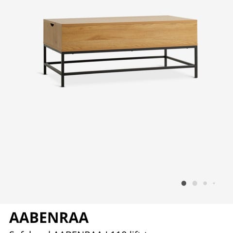 Selger sofabord AABENRAA L110 med lift-top i varm eikefarge. Bordet er kun 1 måned gammelt og fremstår som helt nytt. Praktisk bord med løftefunksjon som gjør det perfekt til å spise eller bruke PC fra sofaen, samt smart oppbevaring under bordplaten. Selges på grunn av flytting.