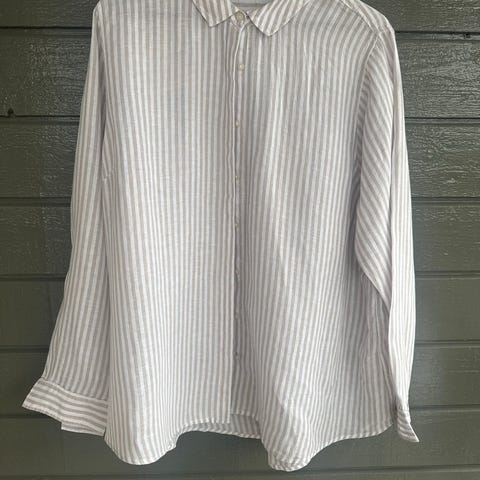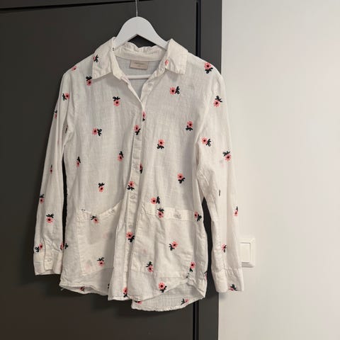 Jeg har for salg en flott hvit skjorte i herlig kvalitet (lenzing og lin) som gjør skjorten lett og luftig. Med flotte broderte detaljer i rødt og gull.