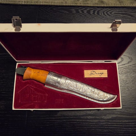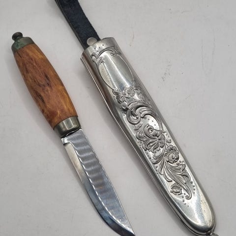 Brusletto eik bunadskniv med tinnslire selges. Kniven er ubrukt. Vikingmotiv på sliren.