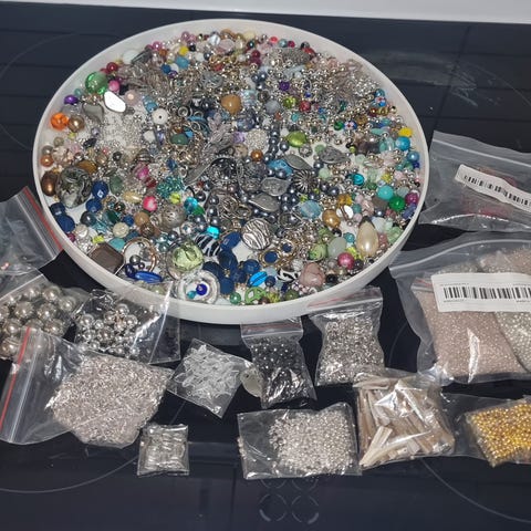 Selger en del perler og ting til å lage smykker, litt tråd i 3 farger, meltallpinner, åpne ringer, mydelige smykke-/ armbåndslpd med delfiner og en stein og masse annet. Seges HBO 100 + porto