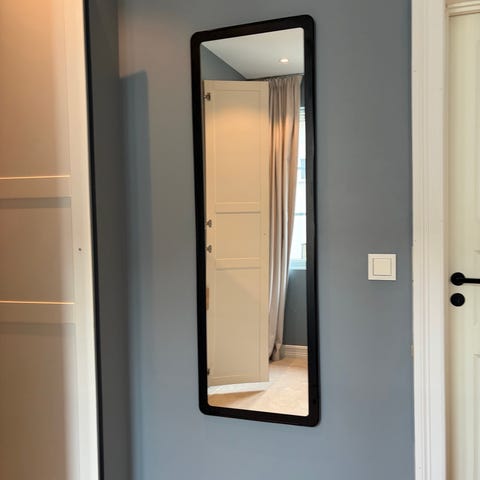 IKEA speil i helfigur med svart ramme. Rektangulær modell som kan brukes som gulvspeil eller veggspeil, avhengig av montering.