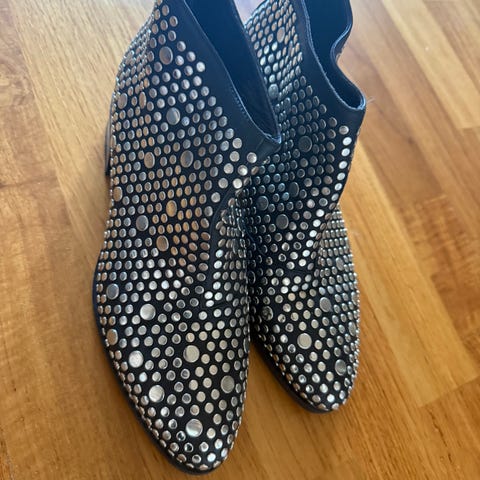 Laura Bellariva hæler i størrelse 39. 5 Ankelhøye sko med rundet spiss og dekorative nagler/sten over hele overdelen. Glidelås bak på hælen for enkel av- og påtaking. Gjennomsiktig blokk-hæl som gir et markert uttrykk. Passer til bruk ved ulike anledninger der man ønsker et mer markert skovalg. Ny pris kr 3699,-
