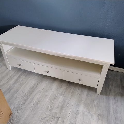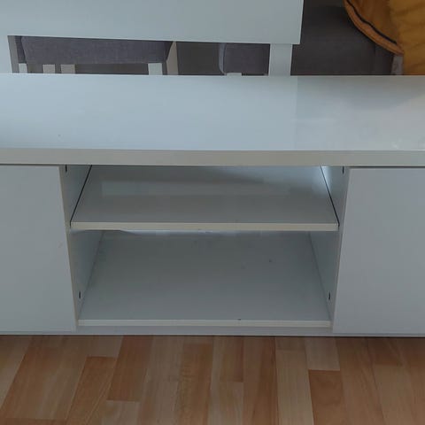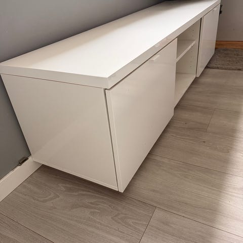 Selger en stilren IKEA BYÅSTV TV-benk i høyglans hvit.