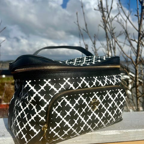 Plass til alt du trenger + litt til🙂 følger med lite speil og veske til koster ol. Rom på utsiden og flere inni. Pent brukt, bare litt sminkerester i den lille vesken.