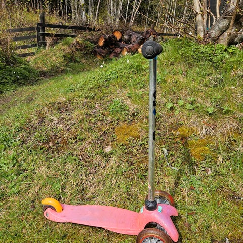 Micro Mini sparkesykkel i grønn farge. Modellen har tre hjul, to foran og ett bak, som gir ekstra stabilitet for mindre barn. Bakhjulet har integrert fotbrems.