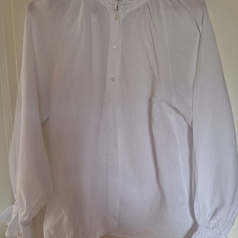 Jeg har for salg en pen bluse fra Levete Room i str XL (liten i størrelsen). Blusen er hvit og i polyester/bomull kvalitet.