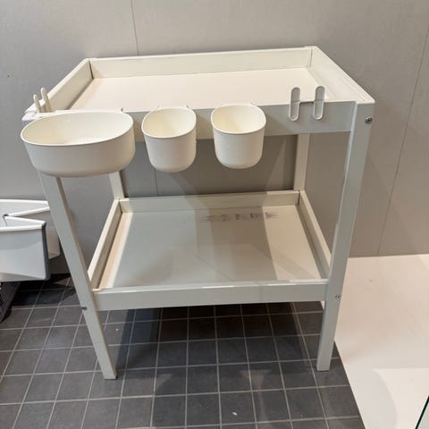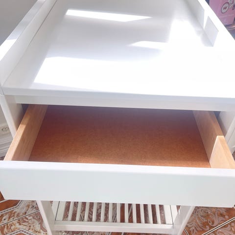 IKEA Gulliver stellebord i hvit. Stellebordet har to hyller under stelleflaten som gir plass til oppbevaring av bleier, klær og annet utstyr. Åpen konstruksjon med sprosser på sidene. Passer til bruk på barnerom eller bad der man trenger en fast stelleplass. Det er synlig bruksslitasje på kanter og flater, se bilder for detaljtilstand. Mål er også oppgitt i bilde.