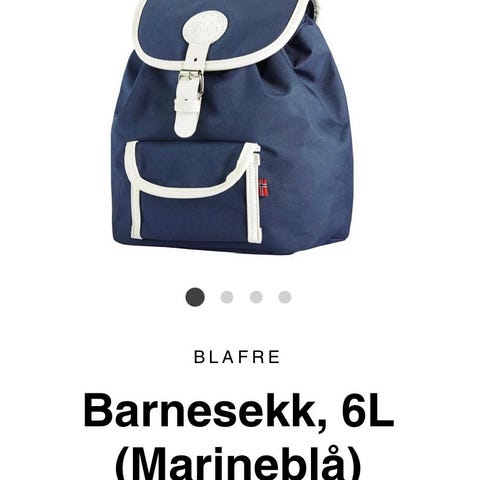 Blafre barnehagesekk i blå farge med hvite detaljer. Sekken har klaff med spenne og snøring under for lukking av hovedrommet. På forsiden er det en liten ytterlomme med glidelås. Bæresystemet har polstrede, justerbare skulderreimer og brystreim med klips. Passer til bruk i barnehage eller som liten tursekk for barn.
