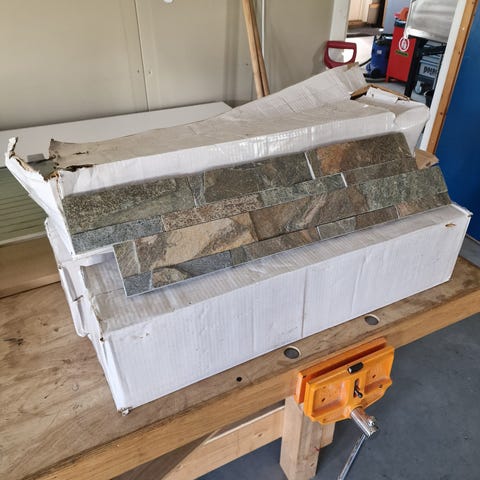 Naturstein skiferfliser i grå nyanser. Flisene har ujevne, rustikke kanter og varierende tykkelse, egnet til bruk for eksempel på mur, fasade eller som dekor på vegg utendørs eller innendørs der skifer er egnet.