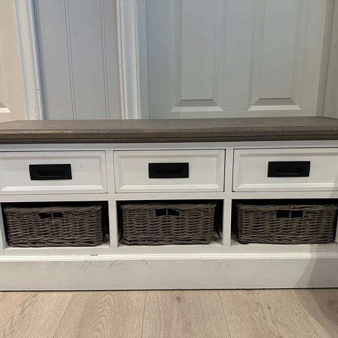 Hvit benk med grå topp-plate og tre hvite kurver til oppbevaring. Passer godt i en gang. Til feks å sitte på når man tar på seg sko. Veier en del.