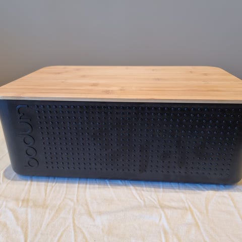 Bodum brødboks med bambuslokk. Brødboksen har et rektangulært design med lys base og lokk i bambus. Lokket kan også brukes som skjærebrett. Egnet til oppbevaring av brød og annet bakverk på kjøkkenbenken.