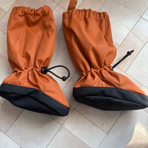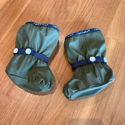 Reflex babyfotsokker i one size. Fotsokkene er i grønn farge med mørke detaljer og strikk øverst for å sitte godt rundt ankelen. Justerbar stropp rundt ankelen med trykknapper gir bedre passform. Egnet som ytterlag utenpå andre sokker eller tøfler for å beskytte små føtter mot fukt og vind ved bruk i vogn eller bæremeis.