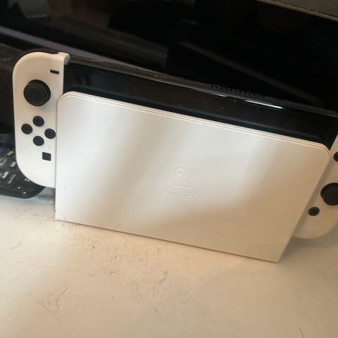 Nintendo Switch OLED spelkonsoll - kun brukt av voksne. Kjøpt 2023. Ekstra lagring 64GB Micro SD. Ingen drift i nokon av kontrollerane. Ekstra joy-cons kjøpt 2025.