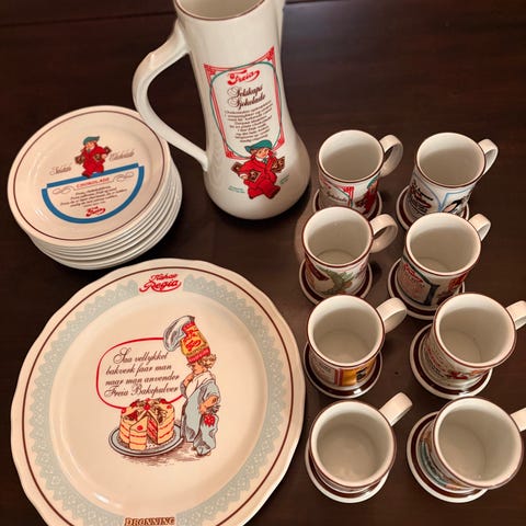 Selger en pen og velholdt samling med klassisk Freia-porselen produsert av Porsgrund Porselen. Dette er tidløse samlerobjekter med nostalgiske reklamemotiver som pynter opp ethvert kjøkken eller samlerhylle.