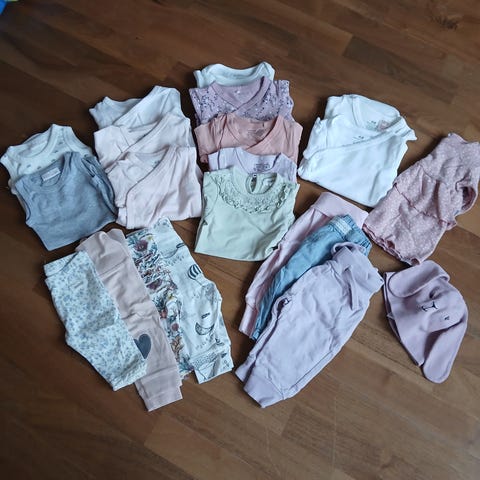 Pent brukt og uten flekker hull. Noe slitasje på den lilla ullbuksen. Hentes eller sendes fra dyre og røykefritt hjem.