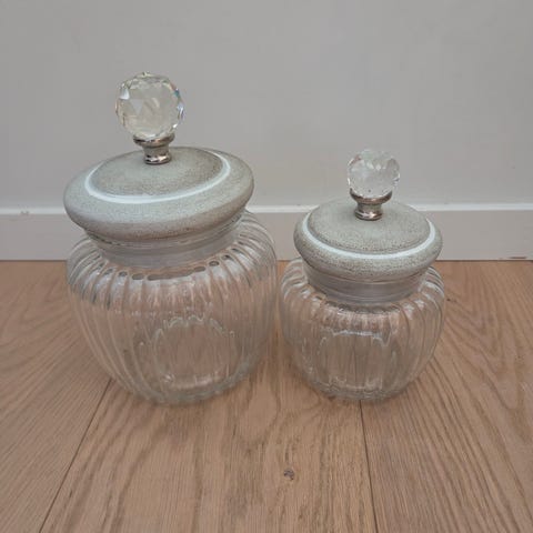 Selger glasskrukker i forforskjellige strørrelser. 4 store og 5 små. De små er perfekte til syltetøy og de store til kjeks eller annen oppbevaring.
