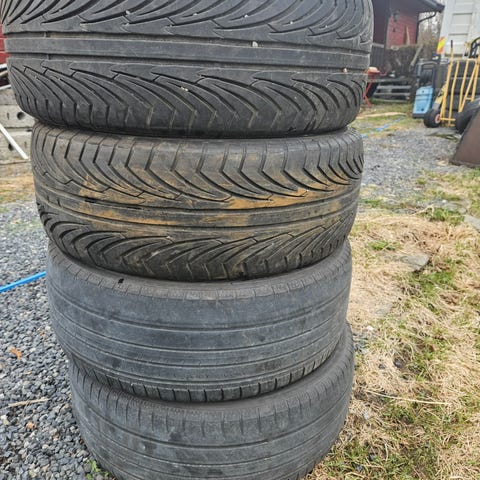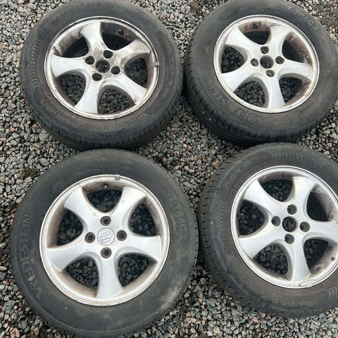 Utslitte dekk, men felgene duger enda. Det ene dekket er punktert. Sommerfelgene er forholdsvis fine. Trenger bare en vask. Vinterfelgene er stygge, men en vask og litt lakk så ser vel dem greie ut og.