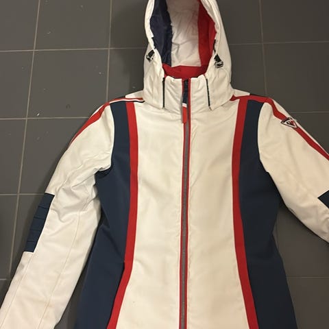 Skidress bestående av jakke og bukse i blå og hvit farge. Jakken har hette, glidelås i front og sidelommer med glidelås. Den er vattert med 3M Thinsulate-isolasjon, som gir lett varme, og har quiltede partier foran og bak. Buksen er mørk blå med glidelåsåpning nederst på bena og glidelåslommer foran. Sett egnet til bruk som skidress eller til annen vinteraktivitet utendørs.