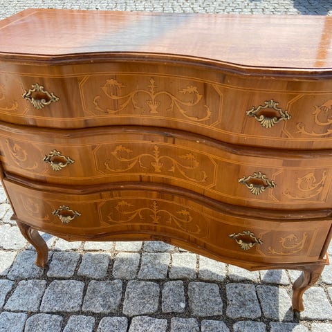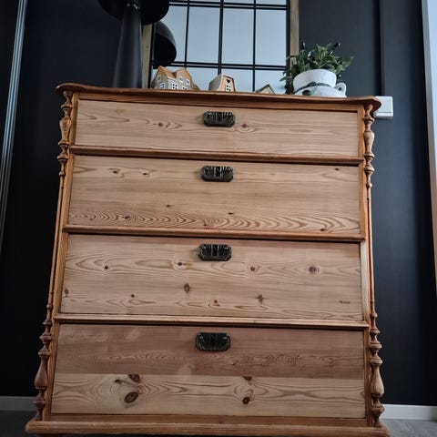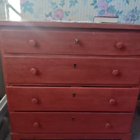 Selger en gammel kommode som har stått på gården i alle år. Trenger plassen i forbindelse med oppussing og denne må dessverre ut. Alder er ukjent. Har nøkkel. Kommoden er todelt med en overdel og en underdel, så veldig grei å flytte. Står en plass der det ikke er behov for å bære i trapp for å komme ut. Noen få av skuffene kan med fordel pusses litt på med pussepapir for å få til å gli lettere.