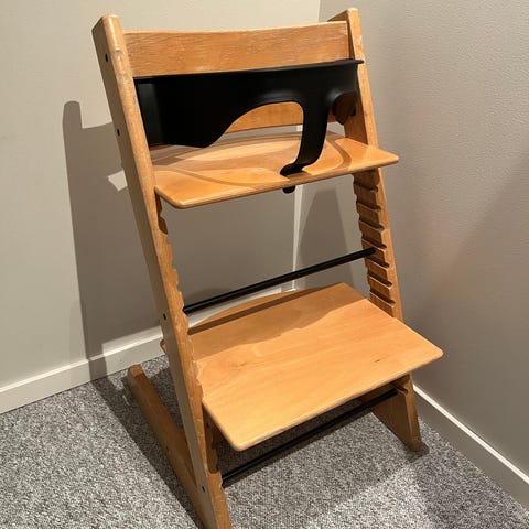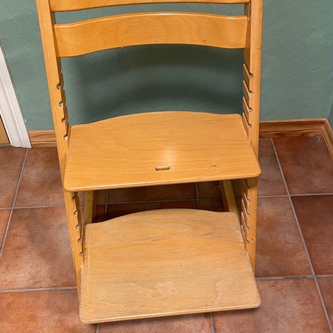 Eldre modell Tripp trapp stol selges. Klassisk høy barnestol med justerbar sitteplate og fotbrett som kan flyttes i høyden etter barnets størrelse. Lite slitasjemerker, men den ene "møbelknotten" under stolen mangler. Dersom du trenger 2 stoler se Finn kode 455593557🙂