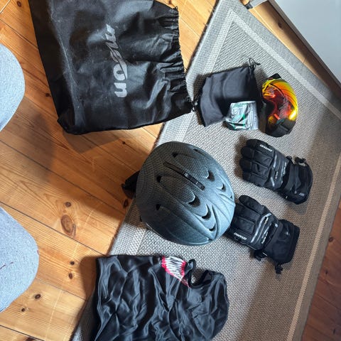 Settet på bildene inkluderer hjelmen samt tilbehør som brille/goggles og oppbevaringspose. Egnet til alpint og snowboardbruk der det kreves godkjent hodebeskyttelse.