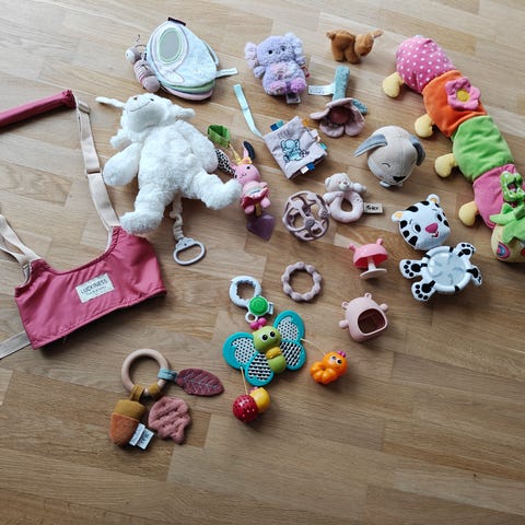 babyleker blandet. Pakken inneholder ulike myke kosedyr, kosekluter, rangler, biteleker, smokkesnorer og andre små babyleker i forskjellige farger og former. Egnet for spedbarn og små barn til sanselek og motorisk trening. Flere materialer, hovedsakelig tekstil og plast. Leveres samlet som én blandet pakke.