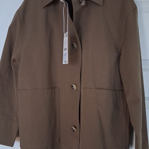 Cellbes jakke for dame i størrelse 50/52. Jakken er i beige bomull og har klassisk krage, knappelukking foran og knytebelte i livet. Modellen har lange ermer og store påsydde lommer foran.