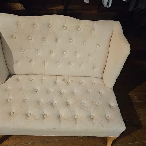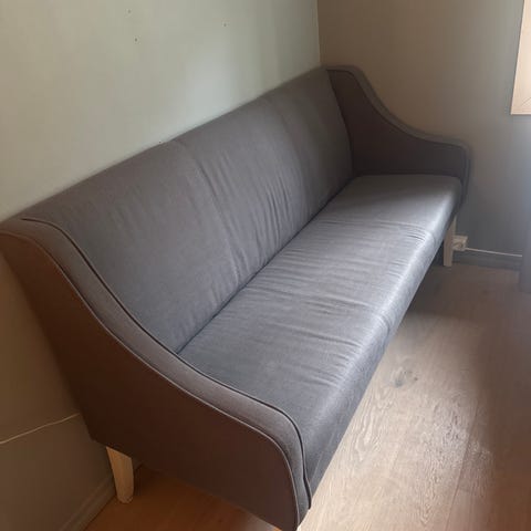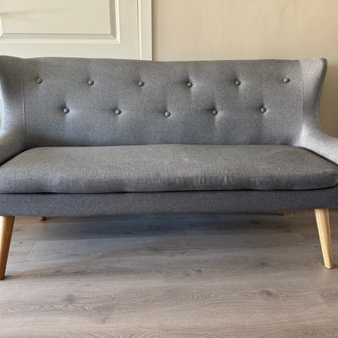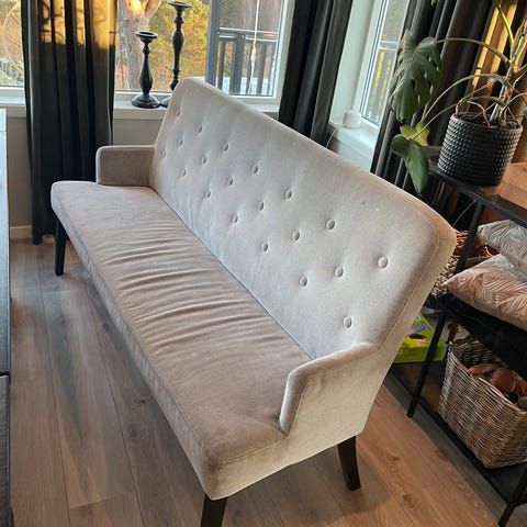 Beige med nagler. Fra Skeidar. Nypris 10 000,- Behagelig sittekomfort. Stoff under er revnet. Ellers i god stand.