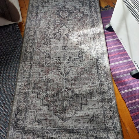 Rugvista gangløpere i grønntoner med orientalsk inspirert mønster. Rektangulær, smal fasong egnet som gangteppe eller løper i korridor, entré eller langs kjøkkenbenk. Teppe med flatvevd struktur og overlockede kanter. Sertifisert etter Oeko-Tex Standard 100 ifølge etiketten på baksiden. Har 2 stk. 800 kr per teppe. Men pris samlet kan diskuteres