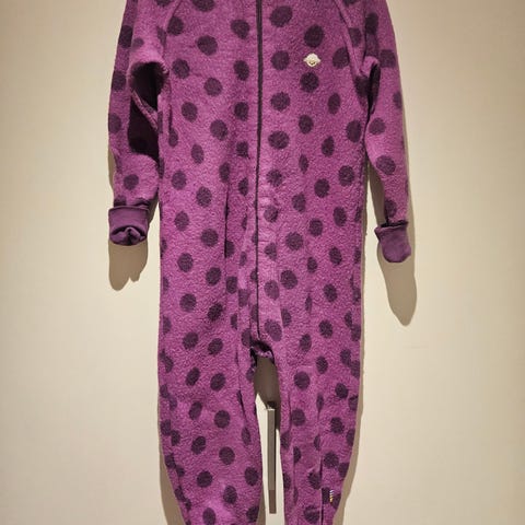Joha ullfleece heldress for barn i størrelse 98/100. Den har lange ermer og ben som kan brettes over som «votter og sokker». Perfekt sovedress til vogn.